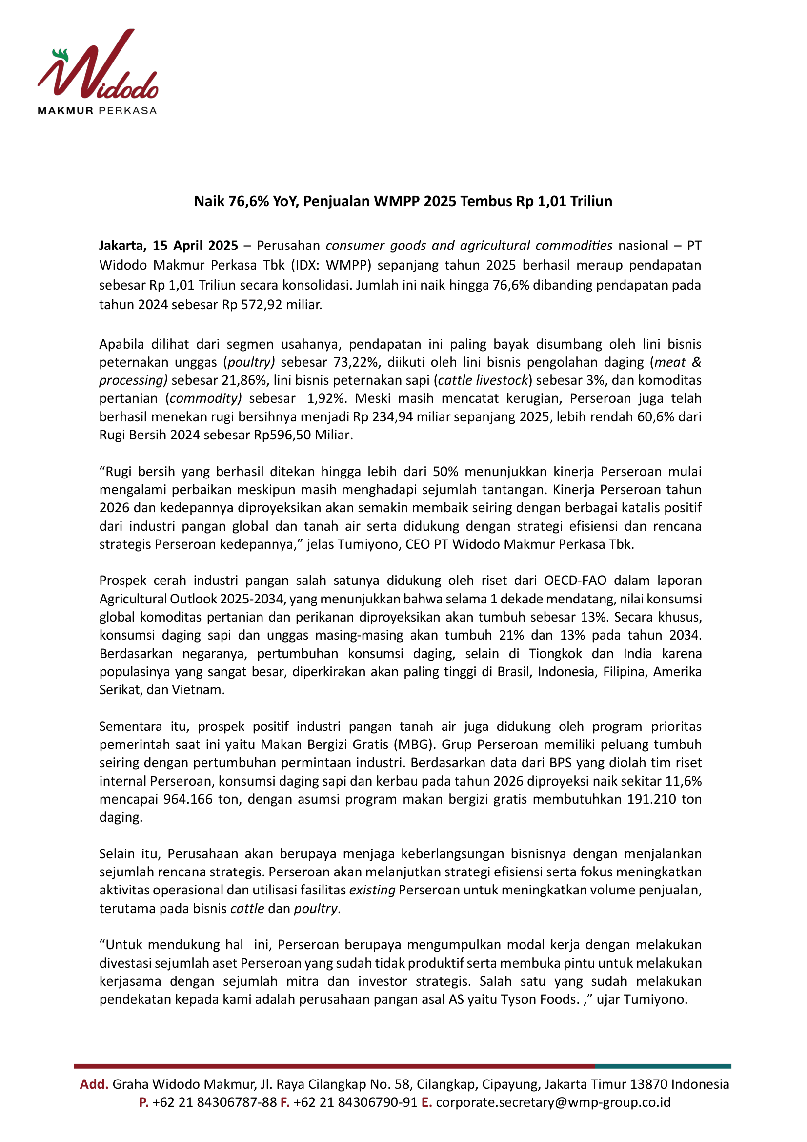 Kontribusi Peternakan Unggas dan Sapi Masih Menjadi Kontributor Utama Pendapatan PT Widodo Makmur Perkasa Tbk Pada Paruh Pertama 2023